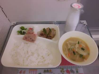 3月17日(金)の給食です。今日のメニューは豚肉のごまだれ焼き、みそ汁、菜の花のおひたし、かつおぶし、ご飯、牛乳です。