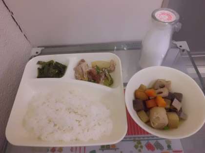 3月23日(木)今日の給食です。本年度最後の給食となりました。メニューは豚肉の甘辛焼き、三色あげ天と野菜の煮物、三度豆のごまあえ、ご飯、牛乳です。