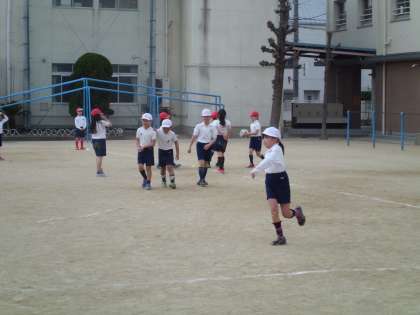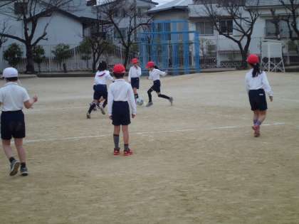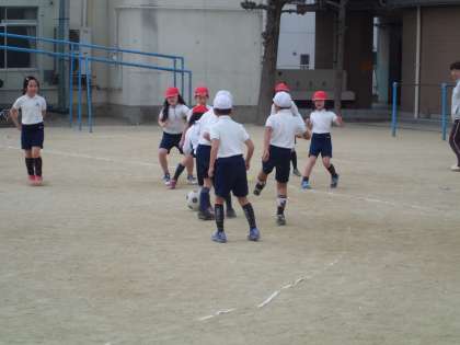 3月14日(火)2時限目、2年生が体育科で「ラインサッカー」の学習をしました。ルールを守り、班で協力し合って練習をしていました。同じ班の人にきちんとパスを出そうとがんばっていました。