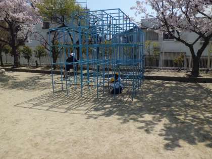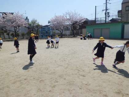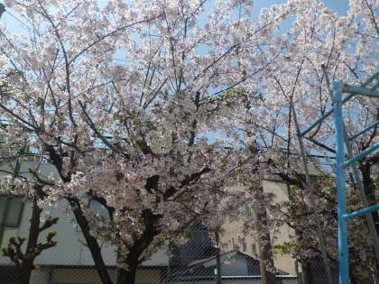 4月13日(木)暖かい日差しで子どもたちが元気に運動場で遊んでいます。桜の花も最近の寒さでまだ満開状態です。