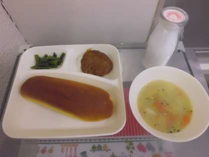 4月17日(月)の給食は煮込みハンバーグ、コーンスープ、三度豆のサラダ、パン、牛乳です。煮込みハンバーグは柔らかく味がよくしみていて、子どもの喜ぶメニューです。私は嫌いなものがないので、何でも食べることができます。好き嫌いのある子どももいますが、毎日の食事で残さず、ありがたく食べるようにしたいですね。
