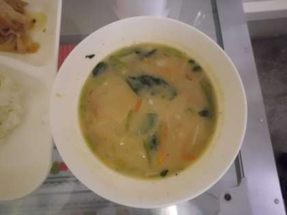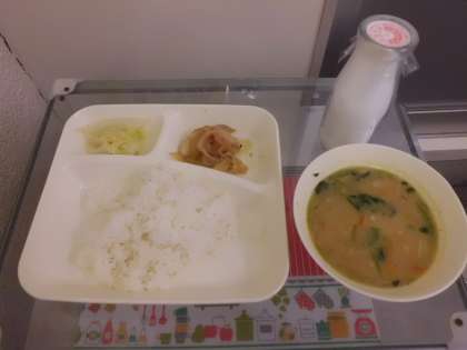 4月18日(火)の給食は鶏肉の甘辛焼き、みそ汁、キャベツの梅風味、ご飯、牛乳です。みそ汁の中には、野菜がたっぷりと入っていました。鶏肉の甘辛焼きはご飯のおかずにぴったりでした。