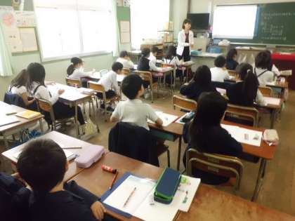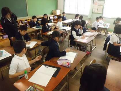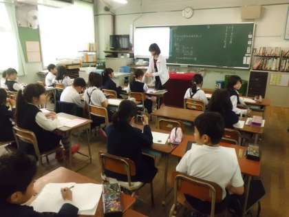 4月18日(火)3年算数科の学習です。視聴覚機器を使用しながら、二人の先生の指導で学習をすすめています。