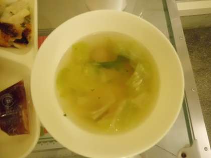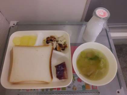 4月18日(水)今日の給食はマカロニグラタン、レタスのスープ、りんご(かんづめ)、パン、牛乳、イチゴジャムです。