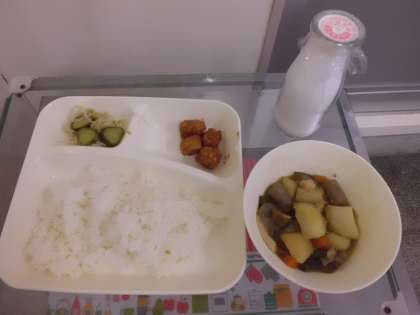 4月20日(木)の給食はまぐろのオーロラ煮、じゃがいもと野菜の含め煮、きゅうりともやしの香あえ、ご飯、牛乳です。含め煮はよく煮込まれていてじゃがいもがやわらかく食べやすかったです。