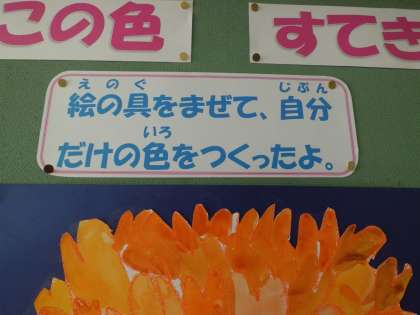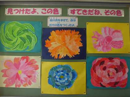 4月24日(月)玄関入って右手の掲示板に3年生の作品を掲示しています。「見つけたよ、この色 すてきだね、その色」という作品です。4月26日(水)の学習参観時にご覧ください。