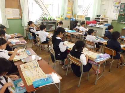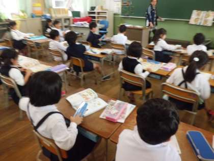 4月25日(火)1年の学習の様子です。1組は算数電子黒板を使っての学習です。2組は国語、大きな声で音読をしていました。