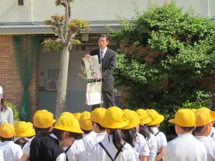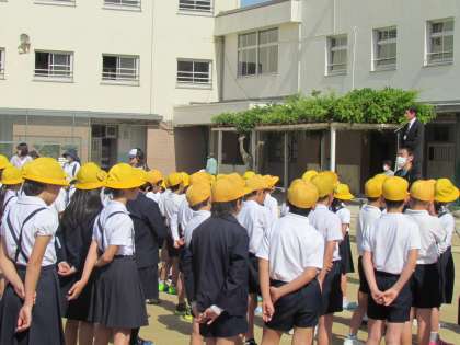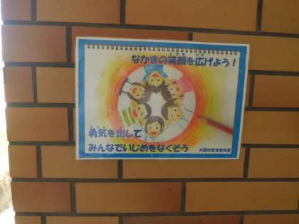 5月8日(月)児童朝会の様子です。今日は全市で「いじめについて考える日」と位置づけて、いじめについて考えていく日になっています。児童朝会で私がいじめについての話をしました。学級ではいじめアンケートの実施、あわせて担任よりの指導、保護者方々にはプリントを配ります。安全・安心な学校、子どもたちが「明日も学校に行きたい」と思える学校を目指します。学級や廊下にはいじめポスターを掲示しています。