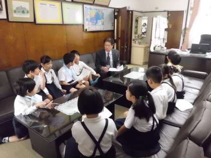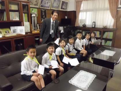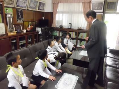 校長室でお話を聞きました。校長先生の名前の中には、3つの生き物が隠れています。