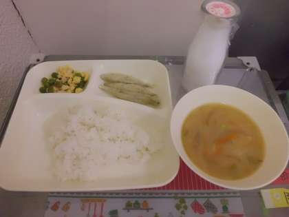 5月11日(木)の給食はきびなごてんぷら、みそ汁、えんどうの卵とじ、ご飯、牛乳です。