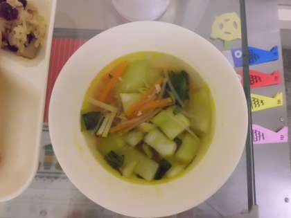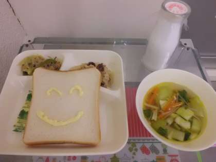 5月18日(木)の給食は金時豆の中華おこわ、中華スープ、ツナと野菜のオイスターいため、パン、牛乳です。
