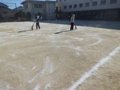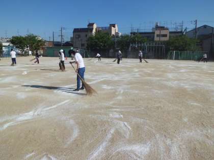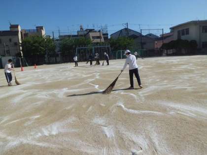 5月19日(金)の放課後運動場ににがり(塩化マグネシウム)をまきました。5月28日(日)の運動会に向けて、土ぼこりがまいあがらないように、毎年この時期にまきます。まき終わると、空気中の水分をすってしっとりとしてきます。