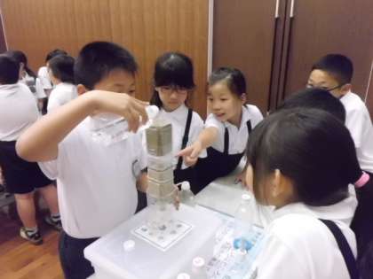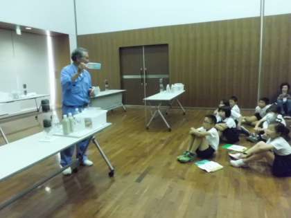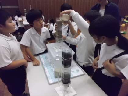 水がきれいになる実験をしました。みんなで協力して行いました。