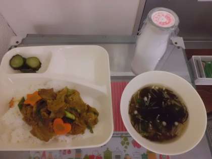 6月22日(木)の給食は和風カレー丼、もずくとオクラのとろり汁、きゅうりの酢のもの、ご飯、牛乳です。