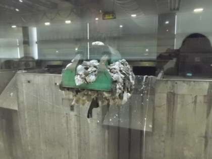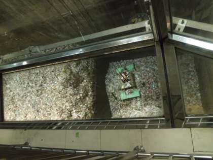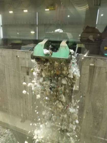 クレーンを動かすには免許がいるそうです。今日は二つの炉が稼働しており、一人の方がクレーンを操作していました。時折、ピットにたまっているごみをかき混ぜます。この日は、勝山小が見学に来ているということで、クレーンでごみを高い所まで持ち上げ、かき混ぜる様子を見せてくださいました。ふだんは、こんな高さでは行わないそうで、大サービスです!
