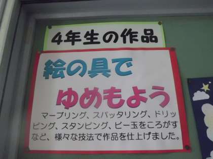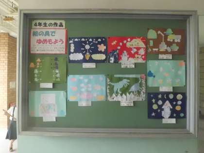 7月4日(火)玄関入って右側の掲示板に4年生の作品が掲示されています。「絵の具でゆめもよう」という作品です。来校された時にご覧ください。