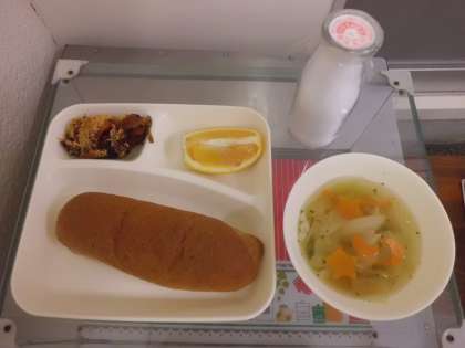 7月6日(木)の給食はかぼちゃのミートグラタン、スープ、オレンジ、パン、牛乳です。ミートグラタンはかぼちゃが柔らかく、デミグラスソースの濃厚な味わいでとてもおいしかったです。スープは具材がたくさん入っていました。