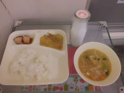 7月10日(月)の給食はさけのさんしょう風味焼き、みそ汁、とうがんの煮もの、ご飯、牛乳です。