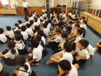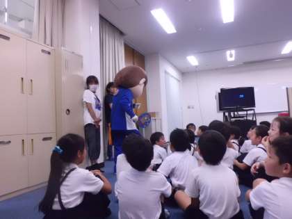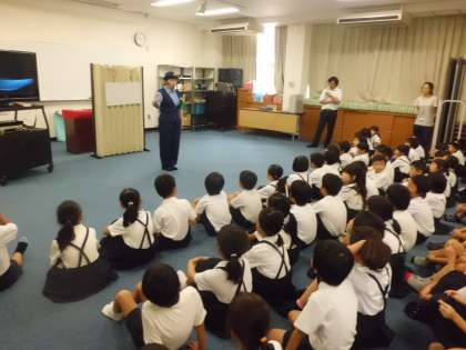 7月7日(金)3時限目に1・2年生合同で防犯教室を多目的室で行いました。(体育は4時限目に実施)大阪府警から2人、生野警察から1人の警察官の方に来ていただき、事件に巻き込まれないためにどのようにしたらいいのか、着ぐるみをきたかたをまじえ、小さい子どもにもわかりやすく教えてもらいました。子どもたちは集中して聞き入っていました。