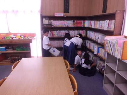 7月11日(火)1年1組の図書の時間の様子です。火曜日は図書補助員の先生が来る日です。サポートしてもらいながら、静かに本を読みました。終わる10分前から読み聞かせがあります。今日は「おれはなにわのライオンや」です。戦争中の動物園での悲しいできごとについてのお話です。7月15日の土曜授業の平和教育に関連して、お話をしてもらいました。