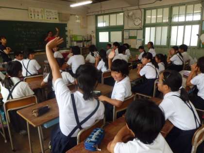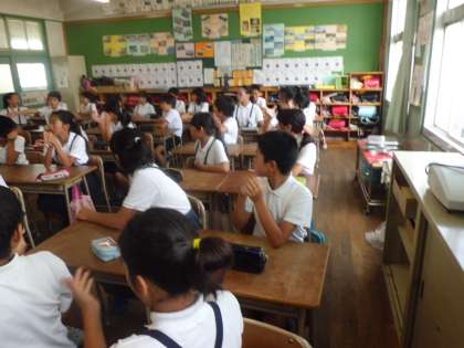 7月14日(金)今日はネイティブの英語の先生に教えてもらう日です。2年・5年・6年と担任とともに英語学習を行いました。初めは声が小さかった子どもたちも、授業を進めていくうちに大きな声で、アクションをまじえながら、表現することができるようになっていきました。