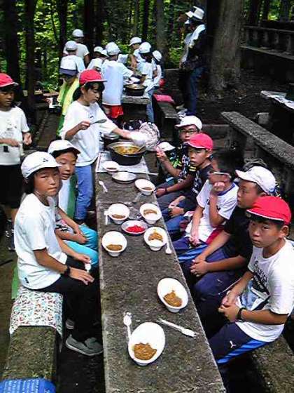 待ちに待ったお昼ごはんです。みんなでカレー作りに挑戦!同じ材料ですが、班ごとにそれぞれの個性が出ています。でも、どれもおいしいです!なんてったって、みんなで作ったカレーですから。