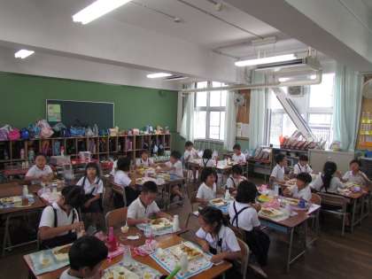 8月30日(水)の給食は子どもたちの好きなカレーライスです。学級の友達と楽しく食べることができています。