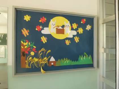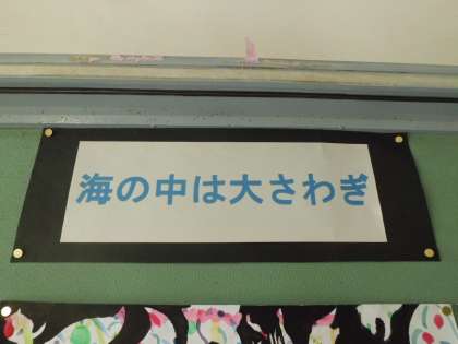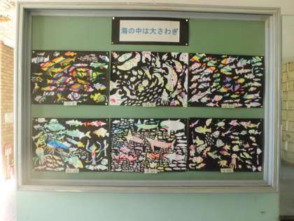 玄関入って左側の掲示板に5年生の作品を掲示しています。「海の中はおおさわぎ」です。来校された時にごらんください。