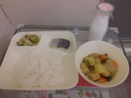 9月7日(木)の給食はさごしの塩焼き、じゃがいもと一口がんもの煮物、キャベツときゅうりのゆずの香あえ、ご飯、牛乳です。