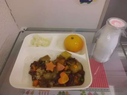 9月11日(月)ビーフカレーライス(米粉使用)、キャベツのピクルス、冷凍ミカン、牛乳です。