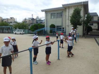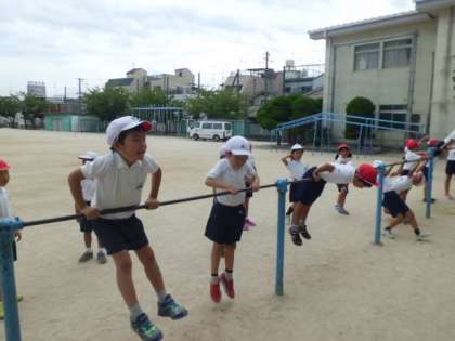 9月11日(月)1年生の体育学習の様子です。今は鉄棒を使った運動です。鉄棒の運動は高さがあり、固いものですから、休み時間の利用がそれほど多くはありません。