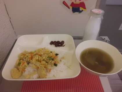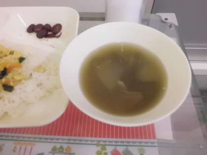 9月21日(木)の給食は親子丼、とうがんのすまし汁、金時豆の煮もの、牛乳です。