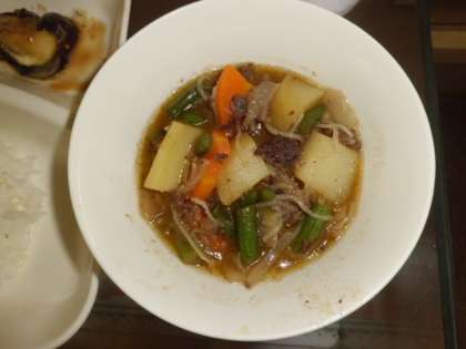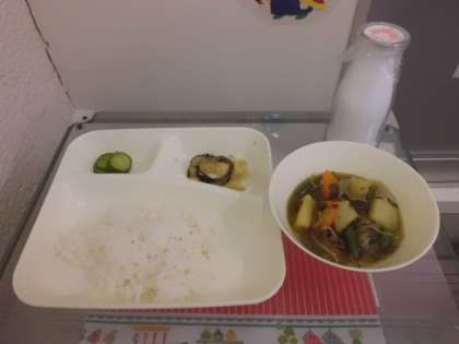 9月22日(金)の給食は肉じゃが、焼きなすのみそだれかけ、あっさりきゅうり、ご飯、牛乳です。肉じゃがはよくたきこまれていて、味がよくしみておいしかったです。焼きなすはしんなりして、みそだれがよくからんでいました。