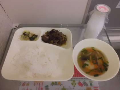 9月25日(月)の給食はプルコギ、トック、チンゲンサイともやしの甘酢あえ、ご飯、牛乳です。プルコギの「プル」は「火」、「コギ」が「肉」という意味で、「火で焼いた肉」という意味があります。「トッ」は「もち」「ク」は「汁」という意味があります。プルコギは甘辛くてご飯がすすむおかずでした。