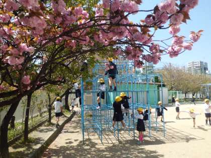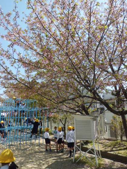 日曜日はくもり空でしたが、今日は一転とてもいい天気になりました。運動場のソメイヨシノは葉桜になりつつありますが、八重桜は満開です。造幣局の通り抜けは。次の土日が見頃のようです。