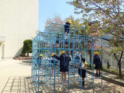 15分休みには、子どもたち、運動場でボールや鉄棒、雲梯、ジャングルジム、一輪車など、学年に応じて思い思いに遊んでいます。男女仲良く遊んでいる姿が印象的です。