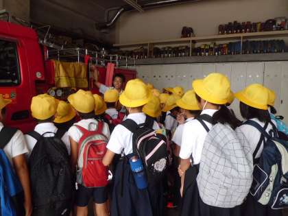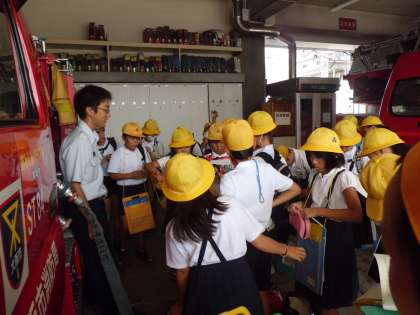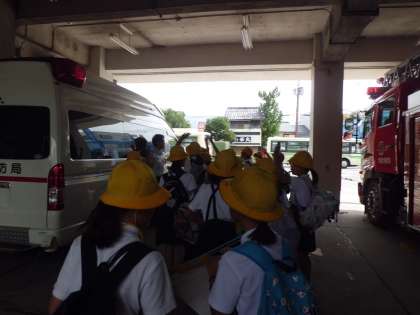 4年生は本日(9月15日)生野消防署に見学に行きました。消防署に停められている消防車の仕組みや設備について、説明していただきました。消火に長い長いホースを使っていることや、多くの水が必要なことなどを教えていただきました。その後、署内で火災についての映画を見て、火事が起こった時の対処の仕方などを学習しました。家の中で火を使うことが少なくなったので、火災件数はたいへん少なくなってきたそうですが、救急車出動件数は年々増加しているということです。