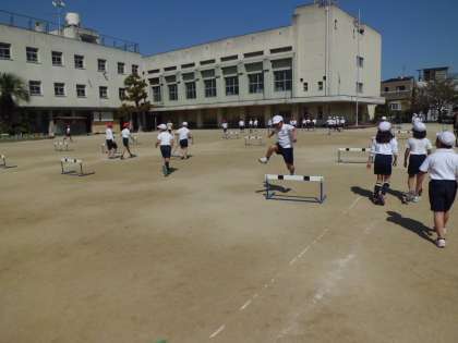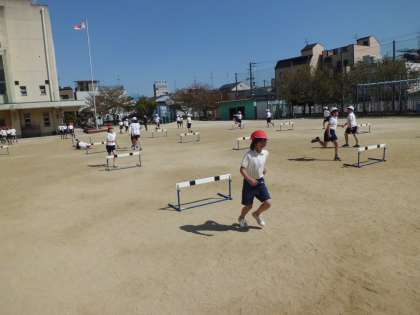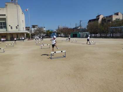 4年生の体育学習の様子です。青空のもとハードルを勢いよくまたぎ越しています。ハードルに少し抵抗がある子もいますが、一生懸命に走っていました。