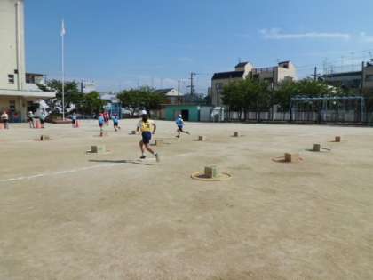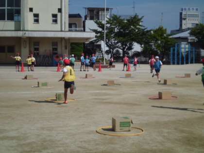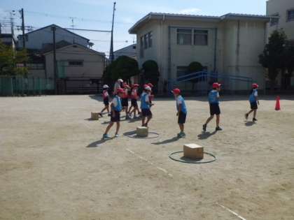 9月19日、ハードル走の前段階の練習です。小さな箱と体操用輪を使い、なるべく低い姿勢でまたぎ越すことを意識します。各グループで目標を持って、お互いにアドバイスしながらくり返し練習をしていました。