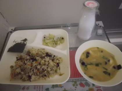 10月2日(月)の給食は牛肉のきんぴらちらし、みそ汁、キャベツの赤じそあえ、きざみのり、牛乳です。赤じそは爽やかな香りがあり、こい赤紫色をしています。主に梅干しの色づけや、しそジュースなどに使われます。また、アントシアニンという栄養があり、目の疲れをとる効果があるといわれています。