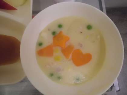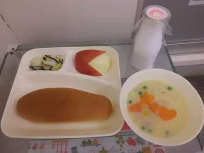 10月5日(木)コーンクリームシチュー(米粉)、キャベツのひじきドレッシング、りんご、パン、ブルーベリージャム、牛乳です。
