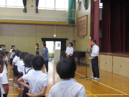 10月2日(月)児童朝会の様子です。今日は雨が降っていましたので、講堂で行いました。竹馬の使い方、乗り方、なおし方など基本的なことについて話をしました。一輪車、竹馬、鉄棒やボールなどいろいろな用具・器具を使って、運動をしてほしいです。最後に図書委員会からお知らせがありました。