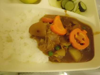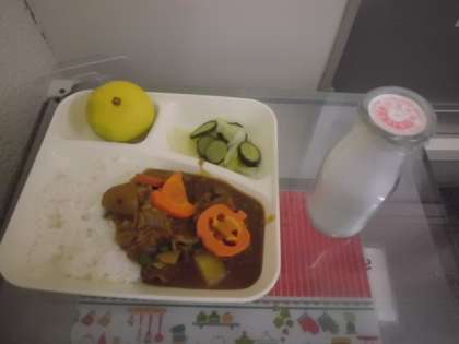 10月12日(木)の給食はポークカレーライス(米粉)、グリーンサラダ、みかん、牛乳です。カレーライスのルーには豚肉や野菜がたっぷりと入っていました。子ども向けの甘口カレーです。