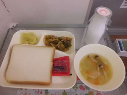 10月13日(金)の給食は豚肉と野菜のケチャップソテー、スープ、スイートポテト、パン、イチゴジャム、牛乳です。豚肉と野菜のソテーはケチャップ味がきいていておいしかったです。スープには野菜がたっぷりと入っていました。