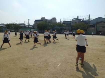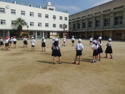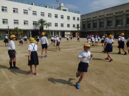 10月11日(水)休み時間の運動場の様子です。暑さがぶり返してきた感じです。玄関の寒暖計が午前中で30度をさしていました。その中、子どもたちは男女仲良く運動場で思い思いに遊んでいます。