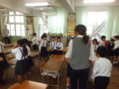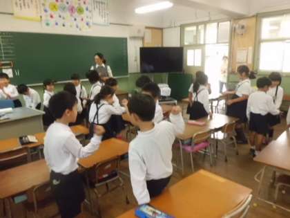 10月14日(土)土曜授業で2時限目に学習参観、3時限目は地域・消防・区役所の方々の応援の防災訓練です。玄関ではPTAによる花市が行われました。