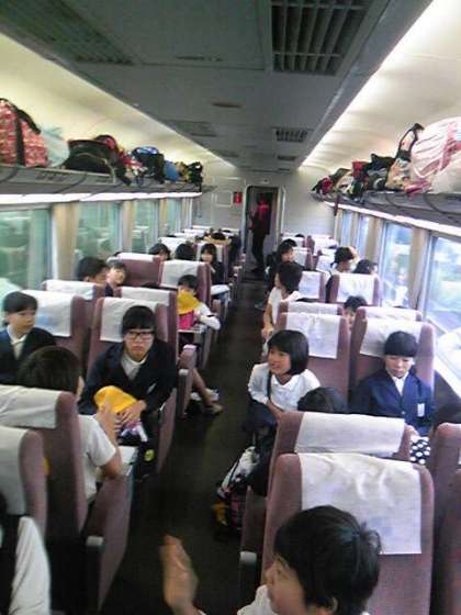 学校を出発して、修学旅行専用列車「あおぞら号」に乗り込みました。いよいよ鳥羽・賢島方面目指して出発です。雨が残念ですが、いっぱい思い出つくって帰ってきます。