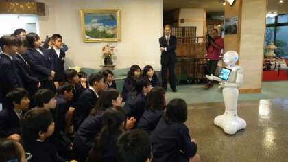 宿舎に到着しました。まず、ペッパー君がお出迎えしてくれました。宿舎で過ごす時間がとっても楽しみです。