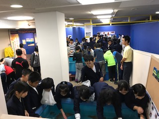 夜の水族館マリンランドに来ました。水槽にいる海の生き物を観察しています。ここは生き物を手で触ったり、つかんだりできます。ちょっとぬるぬるしているけど、楽しいです。