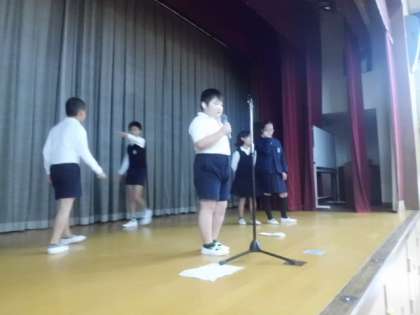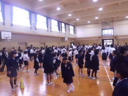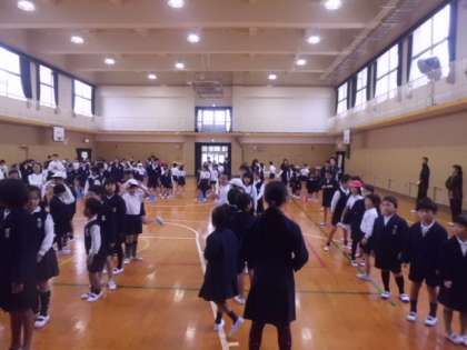 10月19日(木)朝の児童集会の様子です。今日は「じゃんけん列車」です。まずは一人一人がじゃんけんをし負ければ、勝った人の後ろにまわり、肩を持ってつながっていきます。時間がたつにつれて、どんどんと長くなっていきます。その後、後期児童会の役になった子どもたちが自己紹介しました。最後に来週から始まる「赤い羽根」の募金について説明がありました。